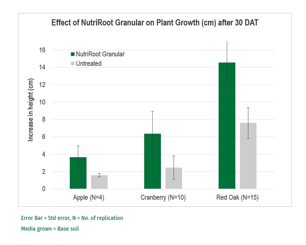 Three plant species—Apple, Cranberry, and Red Oak—were evaluated for height growth over a 30-day period following a single application of NutriRoot® Granular. Growth results were compared with untreated plants to measure product effectiveness.